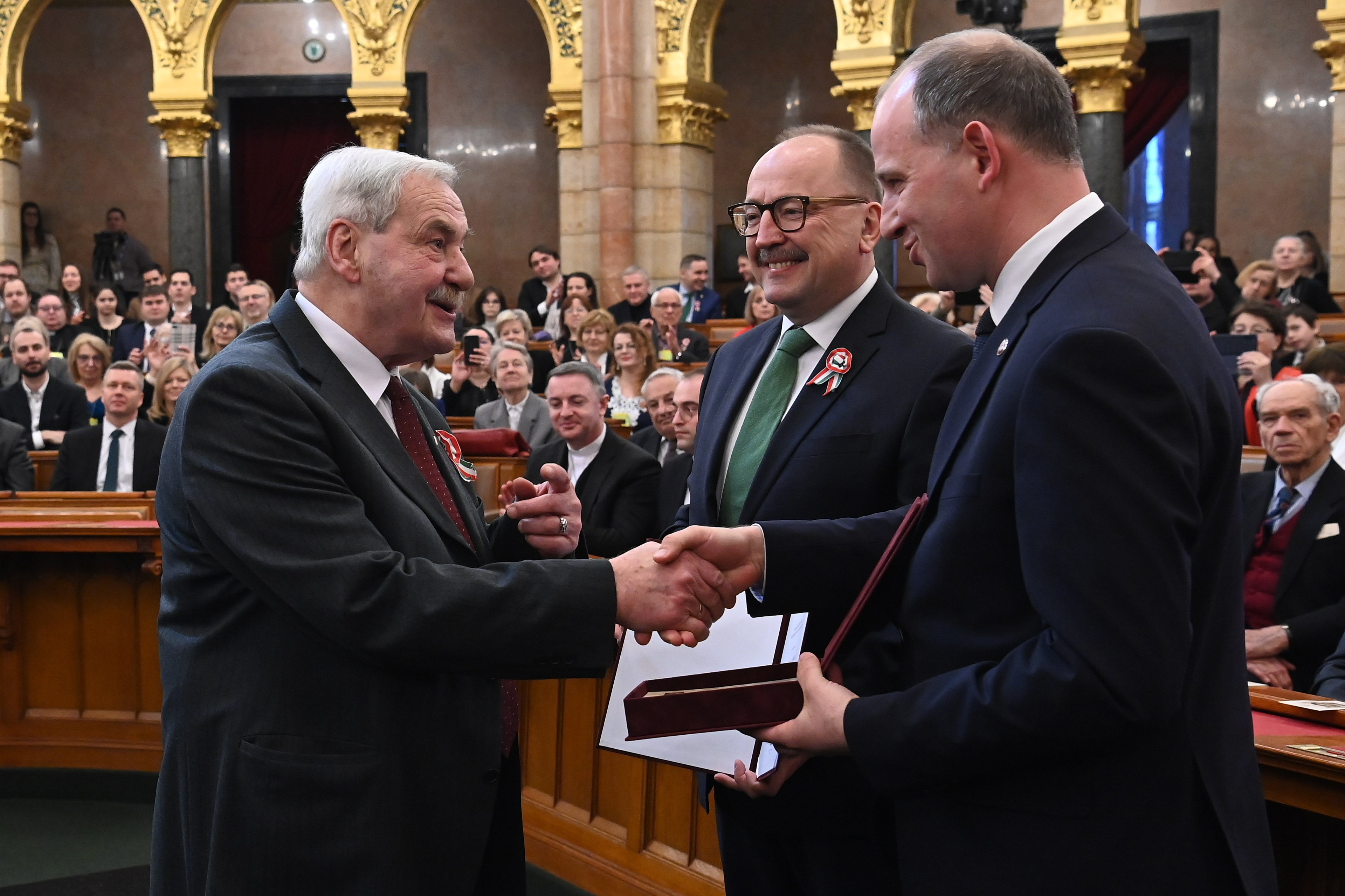 Martényi Árpád, a Rákóczi Szövetség alelnöke (b) átvette az Esterházy-díjat Németh Zsolttól, az Országgyűlés külügyi bizottságának fideszes elnökétől (k) és Csáky Csongortól, a Rákóczi Szövetség elnökétől a mártírsorsú felvidéki politikus emlékére rendezett ünnepségen az Országház felsőházi termében 2022. március 13-án. MTI/Máthé Zoltán