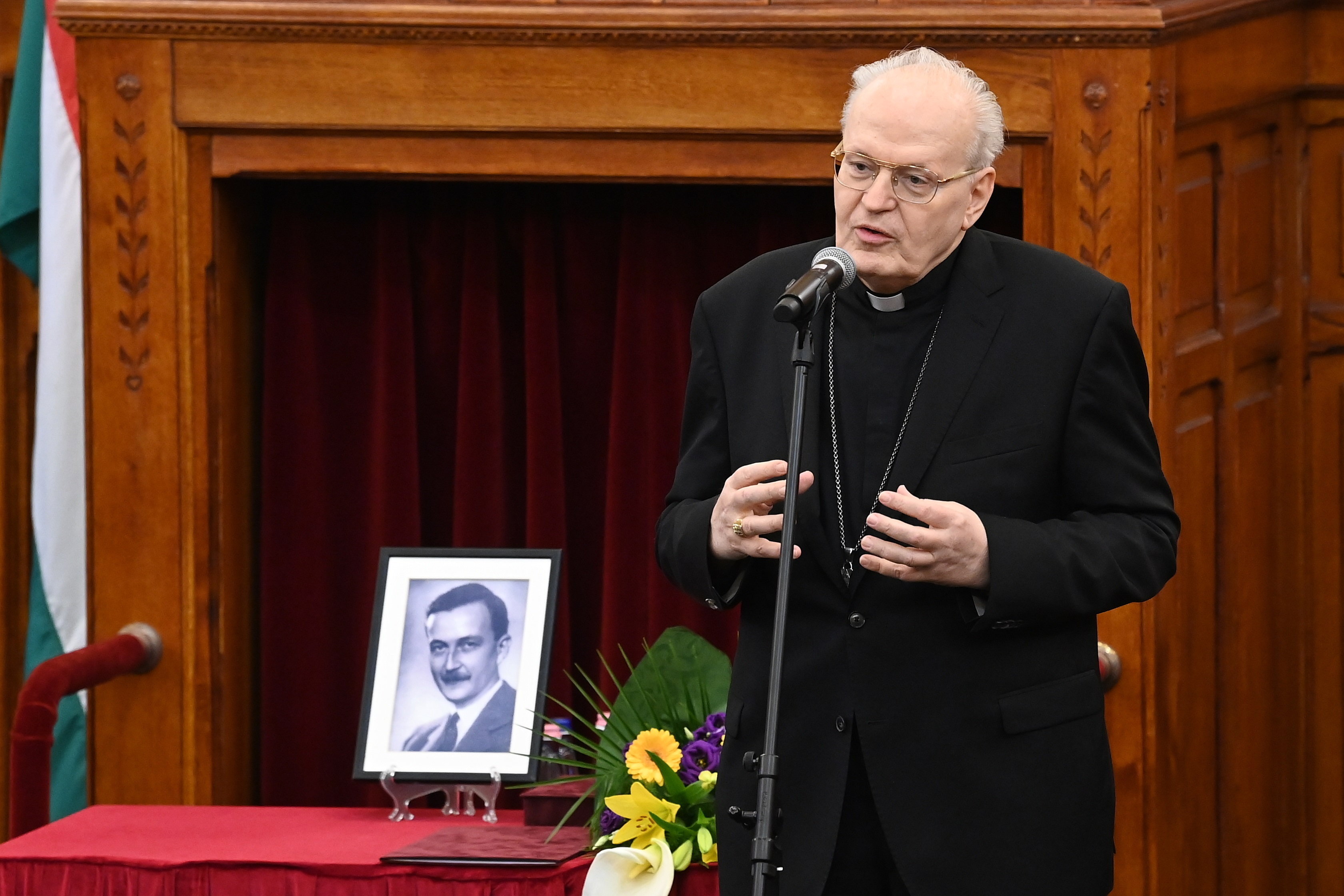Erdő Péter bíboros, esztergom-budapesti érsek beszédet mond, miután átvette az Esterházy-díjat a mártírsorsú felvidéki politikus emlékére rendezett ünnepségen az Országház felsőházi termében 2022. március 13-án. MTI/Máthé Zoltán