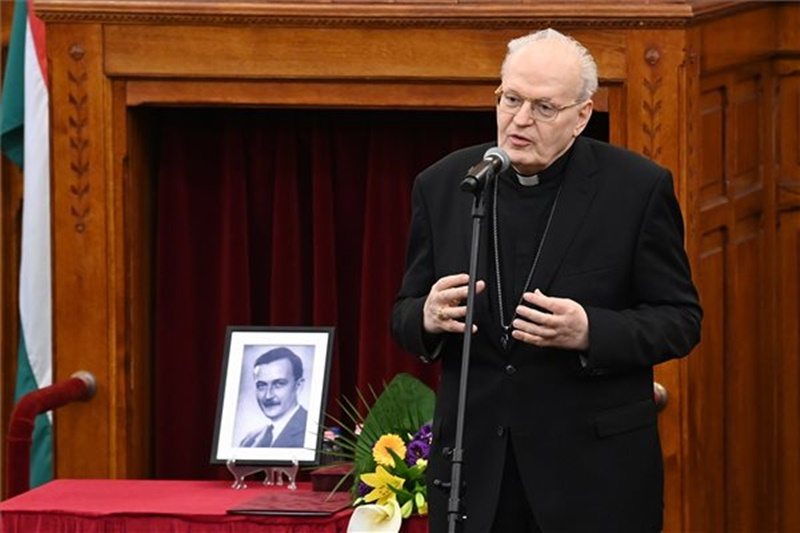 Ma azért gyűltünk össze, hogy a sok érdemért, amelyet az előbbiekben csak részben soroltam fel, bíboros úr a 65 évvel ezelőtt vértanúhalált szenvedett Esterházy János-díjban részesüljön, akiről ezen a héten emlékeztünk meg. Közismert ennek az Isten szolgájának a kijelentése, aki azt mondta: »Csak az a nemzet érdemel jobb jövőt és örök életet, amely értékelni tudja nagyjait, és amely szem előtt tartja példaértékű szorgalmukat.«